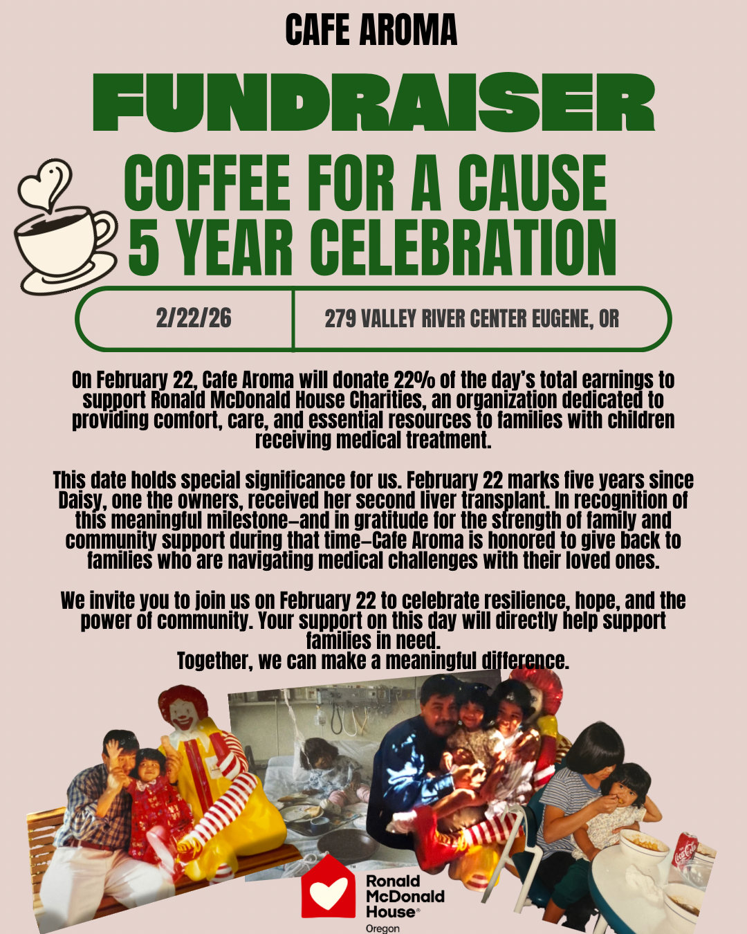 🎉 5-Year Celebration Fundraiser at Café Aroma! This date holds special meaning. February 22 marks five years since Daisy, one of the owners, received her second liver transplant. In honor of this milestone—and in gratitude for the strength of family and community support—Café Aroma is proud to give back to families navigating medical challenges with their loved ones.