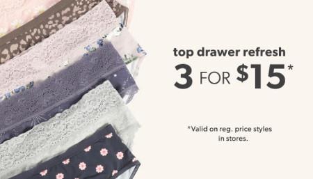 Get it while it lasts! Shop in store and get 3 for $15 panties.